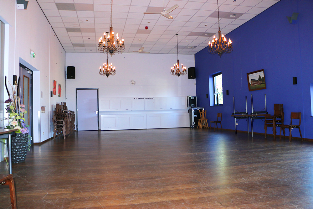 In De Blauwe Reiger kunt u met 30 tot 130 personen terecht. De zaal is hoog en o.a. voorzien van kroonluchters en schemerlampen. De zaal is uitstekend geschikt voor grote bijeenkomsten en muziekuitvoeringen, omdat hij een bijzonder goede akoestiek heeft. Voor voorstellingen kan ook een podium aangebracht worden. Vaste gebruiker is de fanfare. Door middel van schuifwanden kan de zaal uitgebreid worden voor gebruik tot 130 personen.